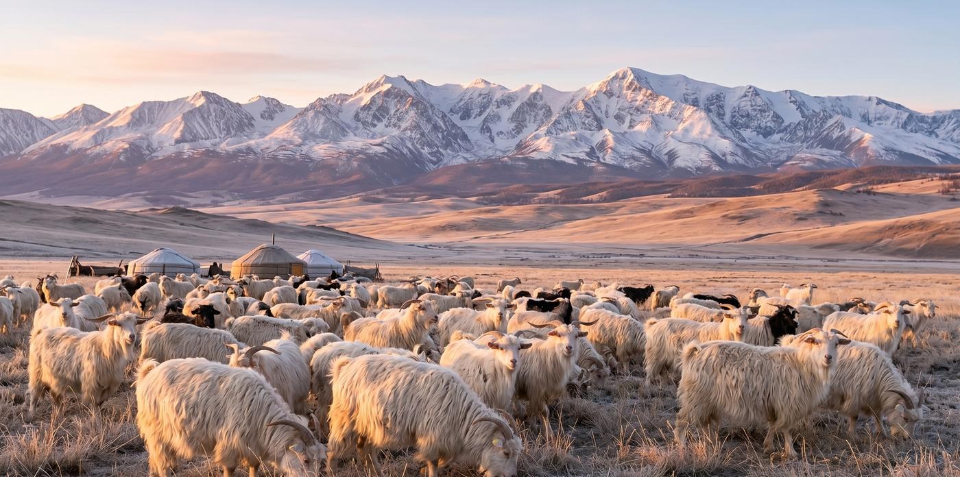 В отличие от обычной шерсти, которую получают при стрижке овец, кашемир добывают совсем иначе. Его основа — нежнейший подшерсток особых высокогорных коз. В суровом климате Монголии животные обрастают этим пухом под плотным слоем основной шерсти, чтобы пережить морозы до -30°C.